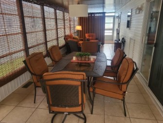 Entrance into lanai with table for six Cozy sitting area at backEntrance from lanai to unitLiving Room Full Size Kitchen View of Dinette and hallway from Living Room Master bedroomLots of Stiorage Main Bathroom Vanity Second BedroomPowder Room Washer in Unit Dryer in unit View from back