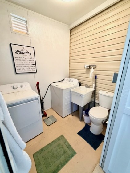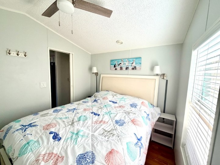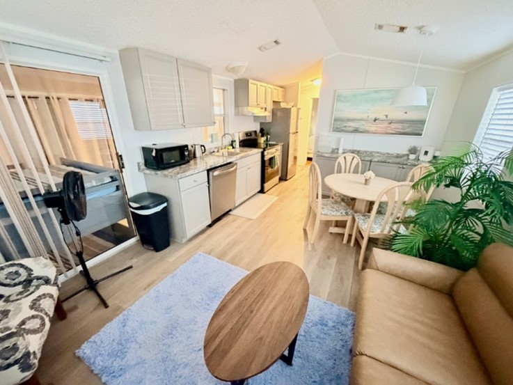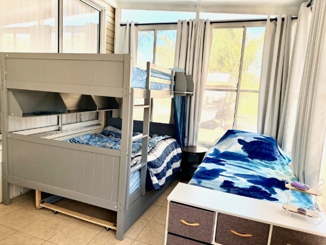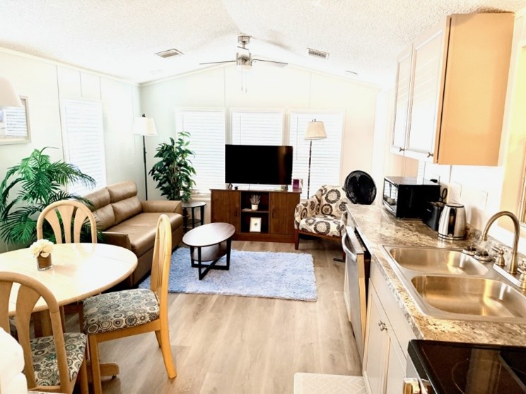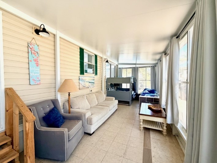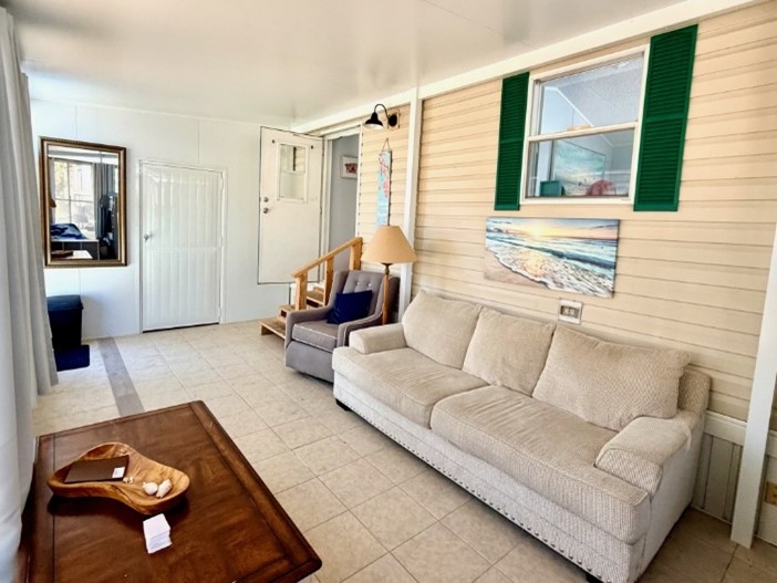 Centrally LocatedEntrance into Lanai with Cozy sitting AreaView to back of Lanai Bunkbed set up and sleeperView of Living room from KitchenView of Kitchen from Living Room Main Bathroom Lots of Storage Vanity in Main Bath Tub and Shower Laundry room with sink and toiletSide Patio with lots Sunshine